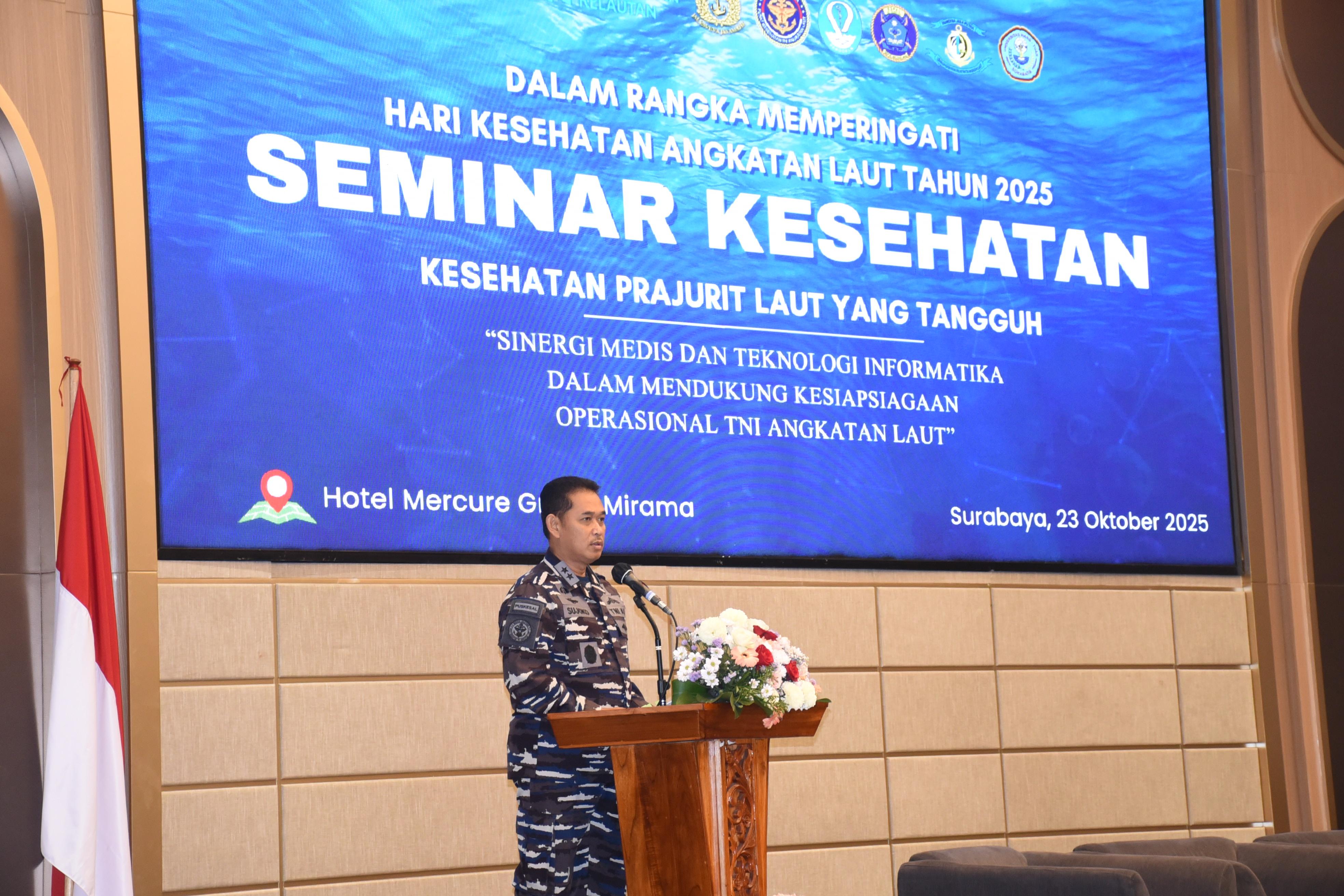 Komandan Rumah Sakit TNI Angkatan Laut Marinir (Rumkitalmar) Ewa Pangalila Letkol Laut (K) dr. Abdul Haris, Sp.BS.,M.Tr.Opsla mengikuti kegiatan Seminar Kesehatan Yang di adakan Oleh Lembaga Kesehatan Kelautan (Lakesla) dengan tema Kesehatan prajurit laut yang tangguh : Sinergi Medis dan teknologi informatika dalam mendukung kesiapsiagaan operasional TNI Angkatan Laut di Hotel Grand Mercury Surabaya, Kamis (23/10/2025).